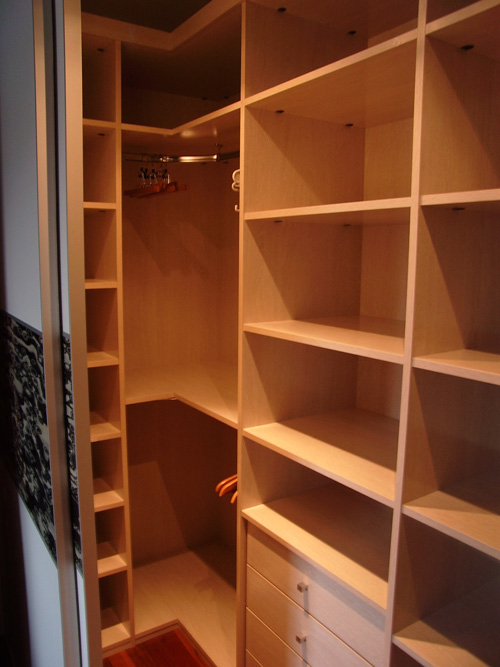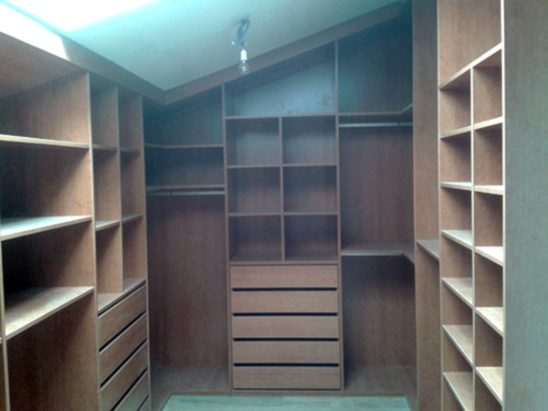 Interior de Armario en melamina tipo vestidor abierto en "U" con techos abuhardillados.